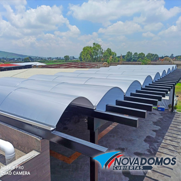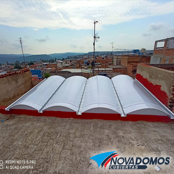 Domos de Policarbonato celular, estructurados o sobre canales de aluminio, los domos de policarbonato pueden ser tipo plano, tipo arco cañón, o tipo rolado . Los domos de policarbonato celular también pueden ser abatibles o corredizos en parte o su totalidad. El policarbonato celular es un producto rígido y ligero que lo convierte en el material ideal para realizar domos, en Novadomos utilizamos policarbonato celular de la mejor calidad solo marcas líderes del mercado Lexan, Poligal, PolNova, Etc. Para poder garantizar nuestros trabajos hasta por 10 años.